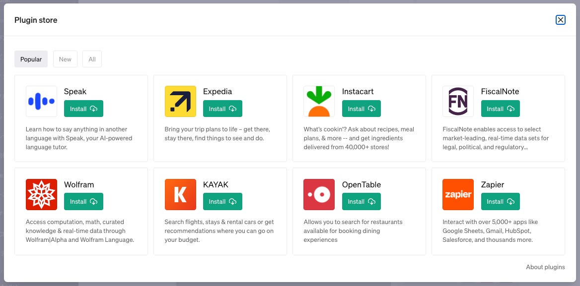2023年5月12日よりPLUSユーザー向けに徐々に使えるようになったChatGPTプラグイン。最初は約80個、日々増えつつあり、このニュースレター執筆時には、125個にもなっていました。